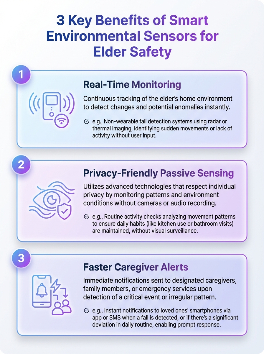 Environmental sensors are particularly useful here because they can detect patterns without capturing images of personal activities. This balance is crucial when older adults value independence and dignity but still want safety support.